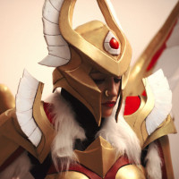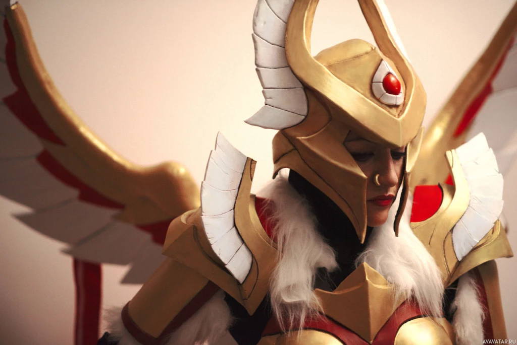 The image shows a person dressed in a cosplay costume that resembles the Legion Commander, a character from
