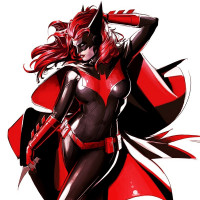 The image features a female character, presumably Batgirl from the DC Comics universe. She is depicted in her iconic costume, which includes red and black elements with white accents. The character is shown in a dynamic pose that suggests movement or action.
