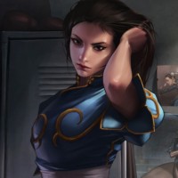a female character dressed in a traditional Chinese martial arts uniform, which resembles the costume worn by Chun-Li from the "Street Fighter" video game series. She is posed in