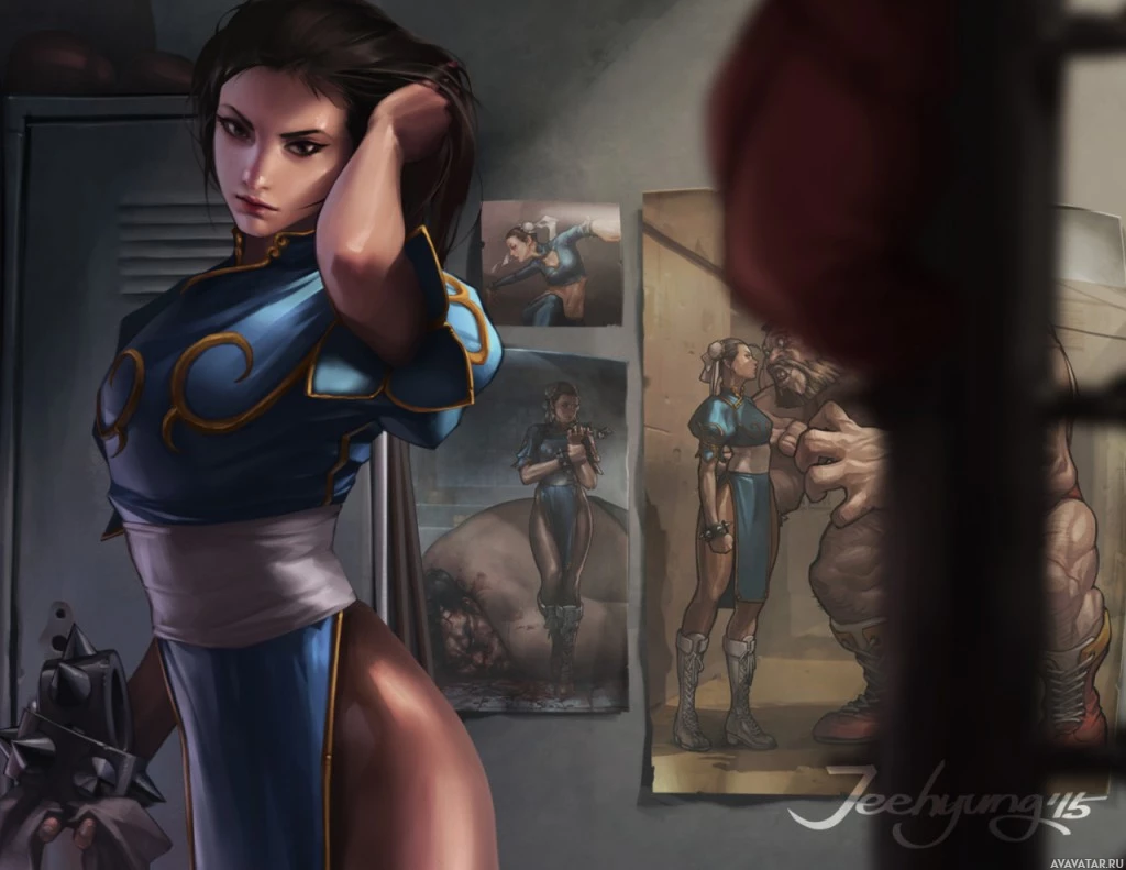 martial arts and characters that appear to be from the same "Street Fighter" universe, suggesting that she is part of this fictional world of martial artists engaging in combat.
