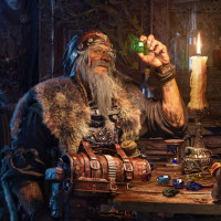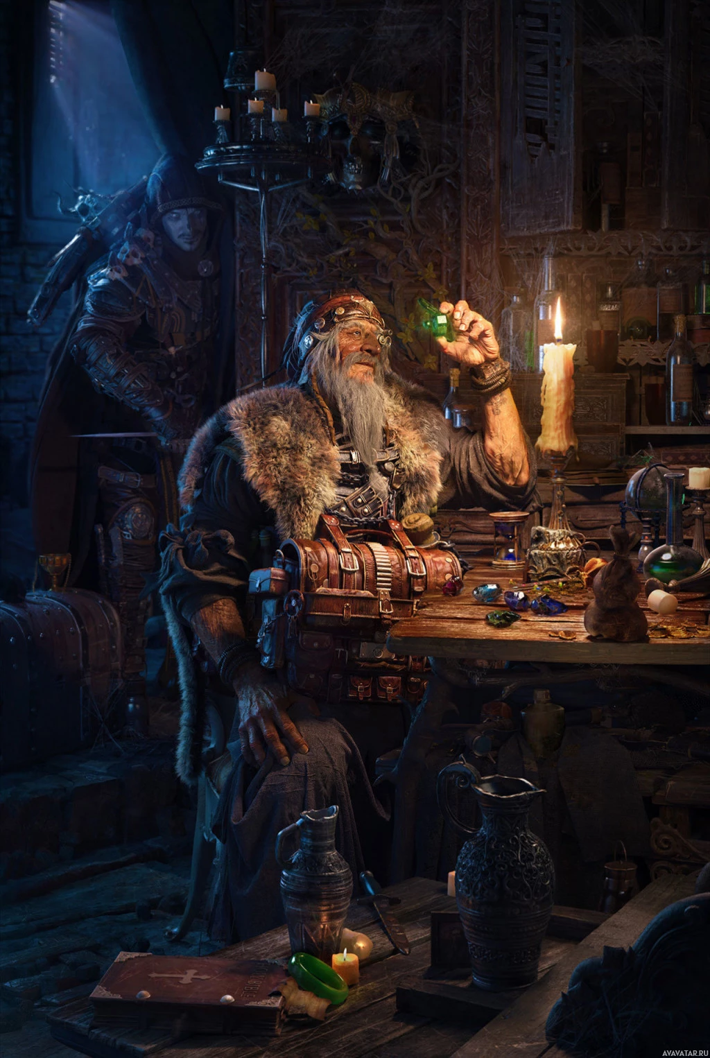 a warm glow to the scene, and there are jewelry items scattered around, which might be ingredients for his work. It's a fantasy-themed setting with an old-