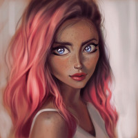 pink hair and blue eyes. She has makeup that emphasizes her features, such as lipstick and eyeliner. Her hairstyle appears to be long and wavy, and she has