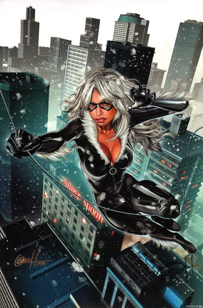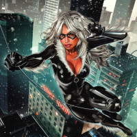 black costume with white fur trim and has a distinctive white mask that covers most of her face. The character is surrounded by a cityscape in winter, indicating a snowy