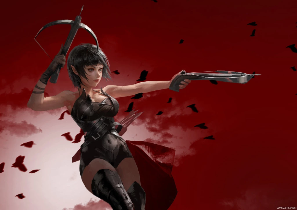 Картинка показывает анимированного персонажа, напоминающего эльфа. Она владеет арбалетом и, кажется, находится в разгаре битвы или действия, как предполагает ее динамическая поза и окружающие обломки. Художественное произведение имеет элементы фэнтези, вероятно, установленные в вымышленном мире, где такие существа существуют.