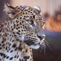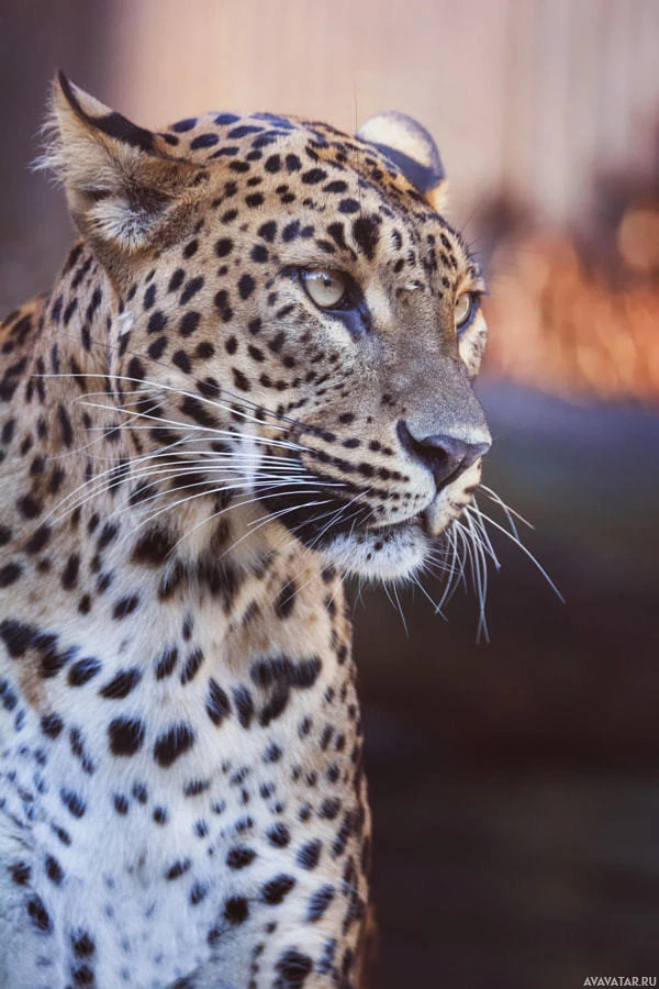 cat family. In this picture, you can see the leopard's face and neck, with its head turned slightly to one side as it gazes off into the distance.