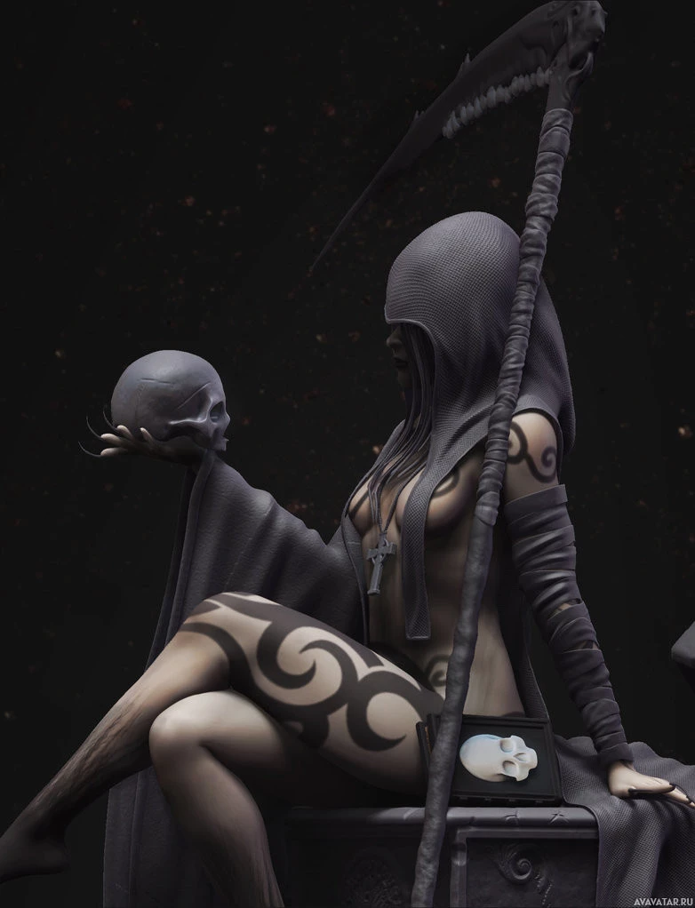 the Grim Reaper, a figure often associated with death and the supernatural. This character is shown sitting on a throne or chair, holding a skull in one hand and a scythe in the other. They are adorned with