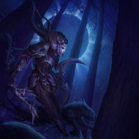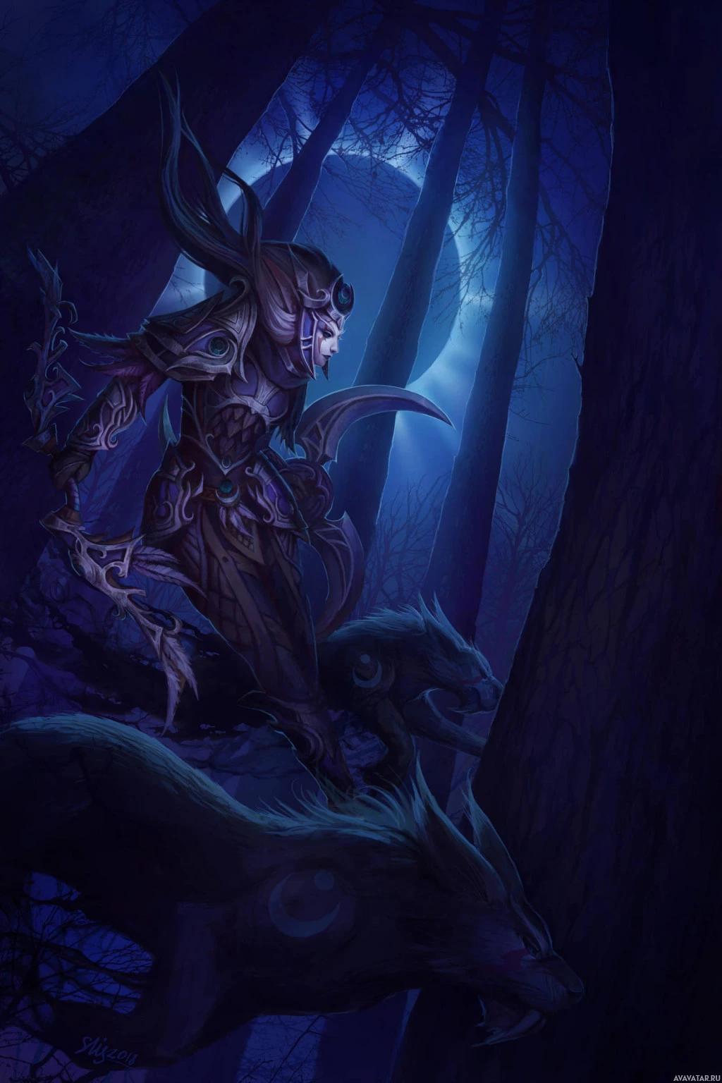 a fantasy scene with an elf riding on the back of a wolf through what appears to be a moonlit forest. The elf is wearing armor and is holding a bow, suggesting they are prepared for combat or hunting. The overall atmosphere of the picture suggests it could be from a fantasy-themed
