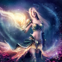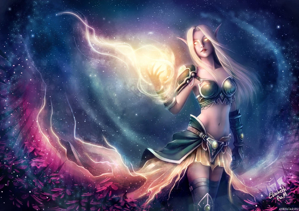 blonde hair and is wearing a detailed green and gold outfit that suggests she might be a wizard or sorcerer due to the staff she holds in her other hand, which emits a magical energy. The background features swirling cosmic elements, enhancing
