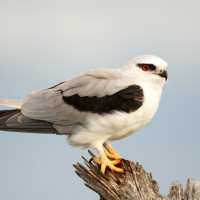 The picture shows a bird perched on what appears to be a wooden post or branch. It is identified as a bird of prey, possibly a falcon given its sharp beak and distinctive coloration. The bird has white feathers with black markings and a prominent yellow eye.