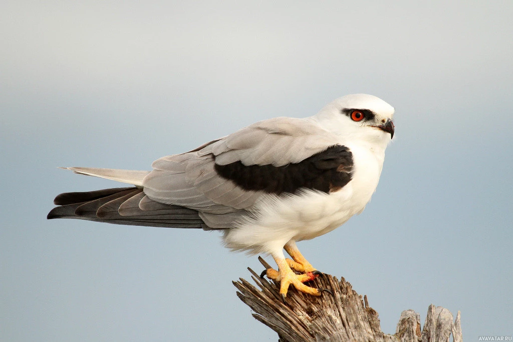 На картине изображена птица, сидящая на деревянном столбе или ветке. Он идентифицирован как хищная птица, возможно, сокол, учитывая его острый клюв и отличительную окраску. У птицы белые перья с черными отметинами и выдающийся желтый глаз.