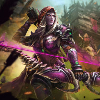 Картинка показывает персонажа из игры «Warcraft», в частности Сильванаса Виндраннера, изображенного в её фэнтезийном обличье. Она изображена с луком и имеет командное присутствие среди хаотической сцены, которая предполагает конфликт в фантастической обстановке.