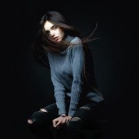 a gray sweater and jeans that have visible rips or cuts in the fabric, suggesting a casual or trendy style. Her pose is relaxed yet thoughtful, with her hands resting on her knees and her gaze directed off to one side. The lighting is moody and dramatic, emphasizing the contours of her face and the texture of her clothing against