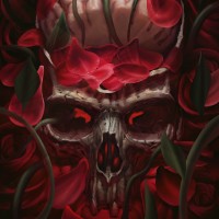 The image depicts a skull with red roses growing out of it. It appears to be an artistic or symbolic representation, possibly related to themes like mortality, beauty in decay, or the transient nature of life.