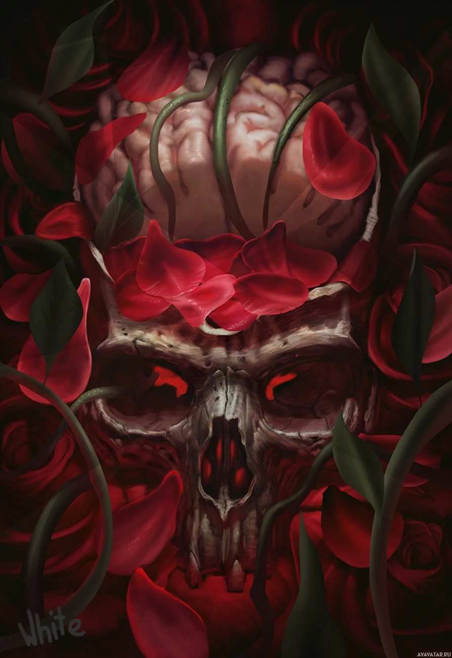 На картинке изображен череп с красными розами, растущими из него. Это художественное или символическое представление, возможно, связанное с такими темами, как смертность, красота в упадке или преходящая природа жизни.