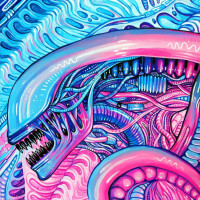 The image depicts an artistic representation of the Alien creatures from the movie "Aliens." It features a detailed, stylized design with vibrant colors and intricate patterns that are characteristic of the aliens' distinctive appearance.