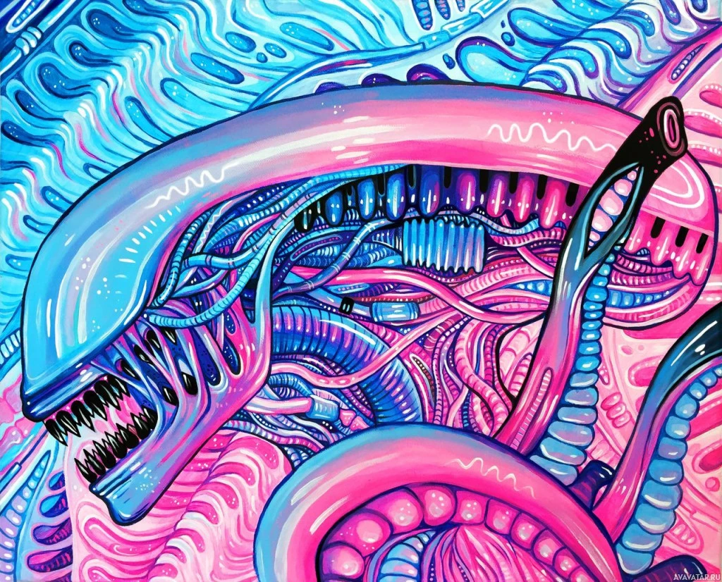 Картинка показывает художественное представление Чужих существ из фильма «Чужие». Он имеет подробный, стилизованный дизайн с яркими цветами и замысловатыми узорами, которые характерны для отличительного внешнего вида инопланетян.