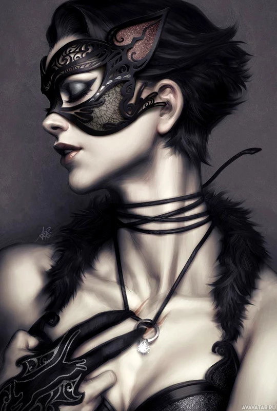 intricate designs and patterns. The overall aesthetic is dark and mysterious, with a strong emphasis on the mask's design and the dramatic