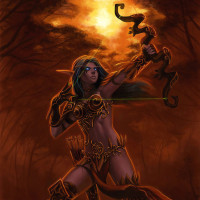 a fantasy character who appears to be an elf, commonly referred to as a drow in the context of Warcraft. She is holding a bow and aiming it, suggesting she may be preparing for battle or