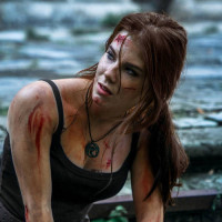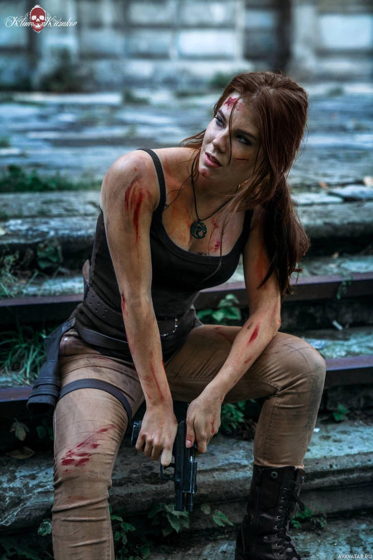 brown pants, a leather holster on one thigh, and what appears to be a belt with additional items attached. The character she portrays is Lara Croft from the Tomb Raider video