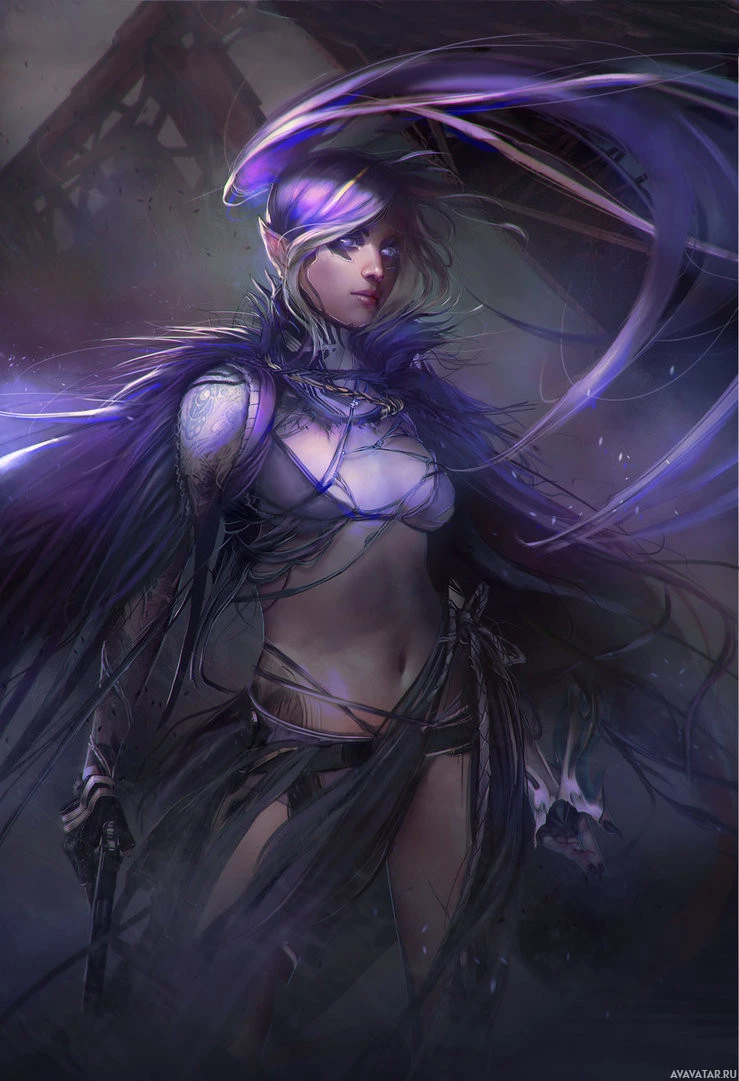 purple hair. The character is depicted in a dynamic and somewhat dramatic pose, suggesting movement or action. She has pointed ears characteristic of elves in