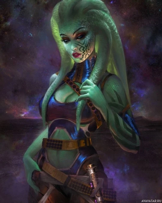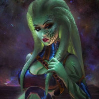 the Star Wars franchise, specifically resembling Mon Mothma from "Star Wars: Episode VI - Return of the Jedi". She is portrayed as a green-skinned humanoid with long, snake-like hair and her arms crossed. She's wearing a blue and purple outfit that seems to be inspired by the character's