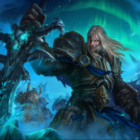 the Lich King, who is one of the primary antagonists in the game's lore. He is shown with an imposing presence, wearing armor and wielding a sword that seems to be imbued with
