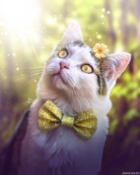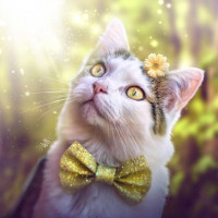 На снимке изображен кот, одетый в золотой галстук с желтыми цветами. Кошка имеет любопытное выражение лица, глядя в сторону. Это, по-видимому, отредактированная или отфотошопированная фотография с причудливой и игривой темой, поскольку кошки обычно не носят аксессуары, такие как галстуки для лука, в своем естественном состоянии.