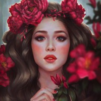 rosy cheeks and is looking towards the viewer with a subtle expression on her face. She's adorned with roses in her hair, which adds to the romantic and whimsical nature of the artwork. The background consists of a soft