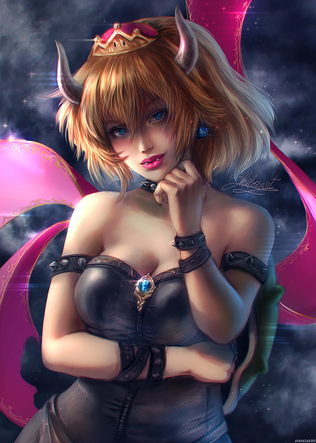 a creative take on Bowser and Peach from the "Super Mario" series, often referred to as "Bowsette." This artistic fusion presents