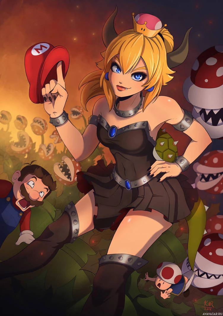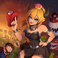 a pink dress and blue jewelry, but she also carries some items associated with Bowser, such as her fire breathing abilities and the presence of Koopa shells around her. The setting appears to be inspired by scenes from