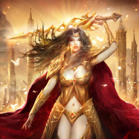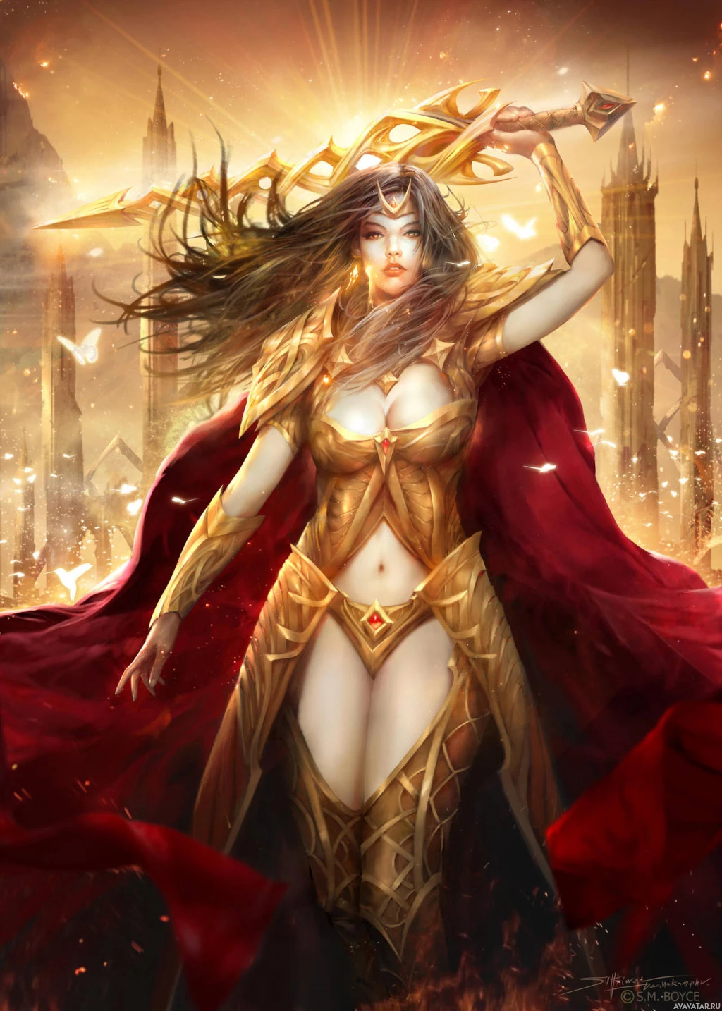 a fantasy character, who appears to be a female warrior or heroine. She is wearing armor with