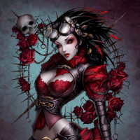 brunette hair, wearing a red and black outfit. She has a skull on her shoulder and is holding a gun in her hand. The attire gives an impression of a cyberpunk or steampunk style, possibly representing a character from