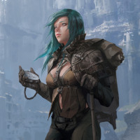 Картинка показывает женского персонажа с бирюзовыми волосами, стоящего на том, что кажется скалистым обрывом или краем скалы. Она одета в доспехи и носит рюкзак. Ее одежда предполагает, что она может быть воином или авантюристом. На заднем плане показана пересеченная местность, которая может указывать на горный регион или место исследования.