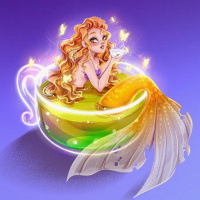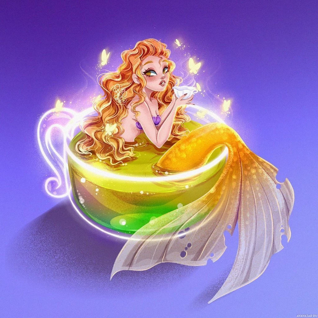 long hair, sitting in a large green cup filled with yellow liquid, which resembles a magical or enchanted drink. The mermaid is also holding what appears to be