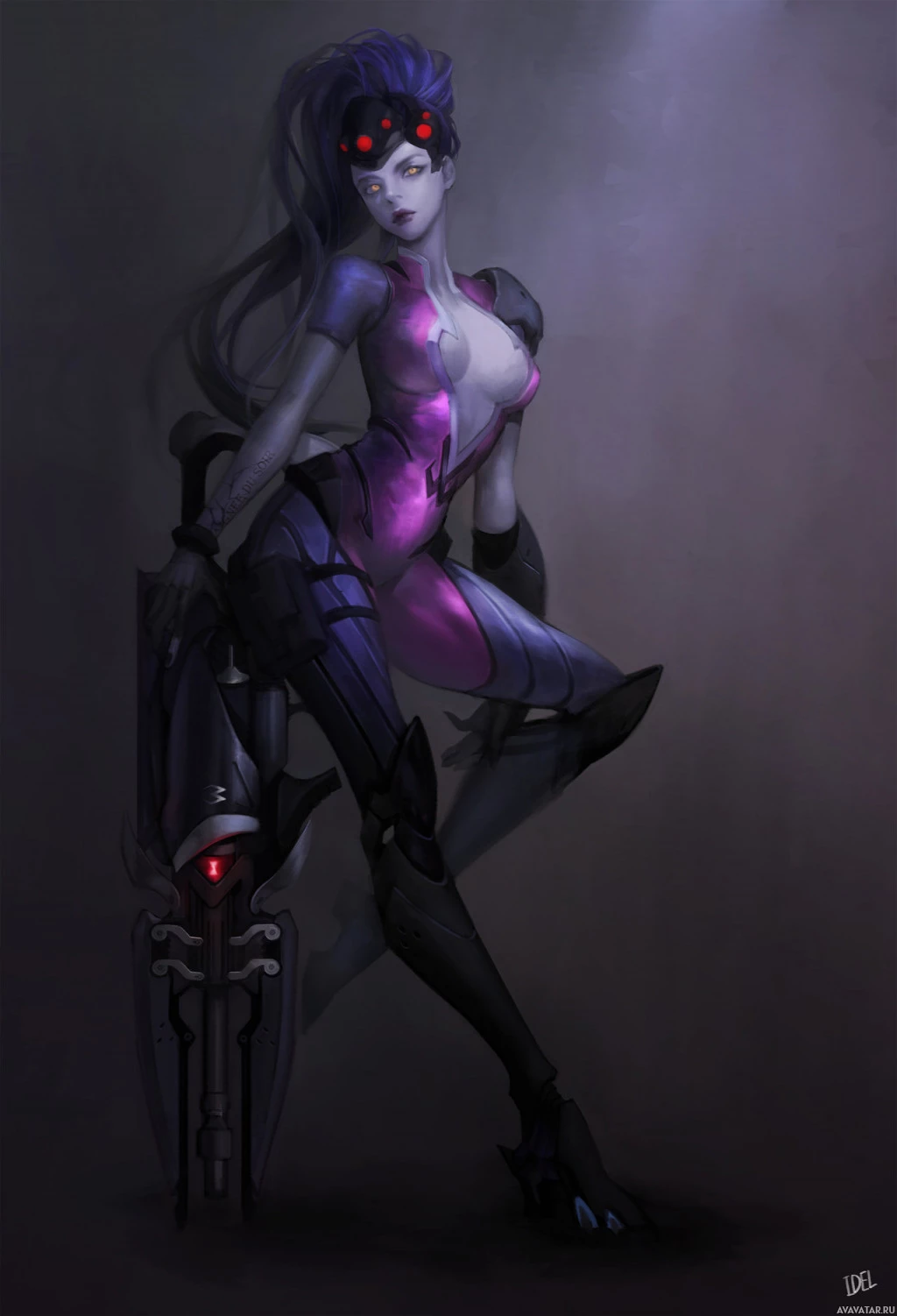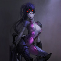 The image features an illustrated character that appears to be Widowmaker from the video game Overwatch. She is depicted in her signature purple and black suit, with a weapon holstered on her thigh. The artwork captures her confident and sultry pose, which is typical of the character's design in the game.
