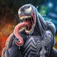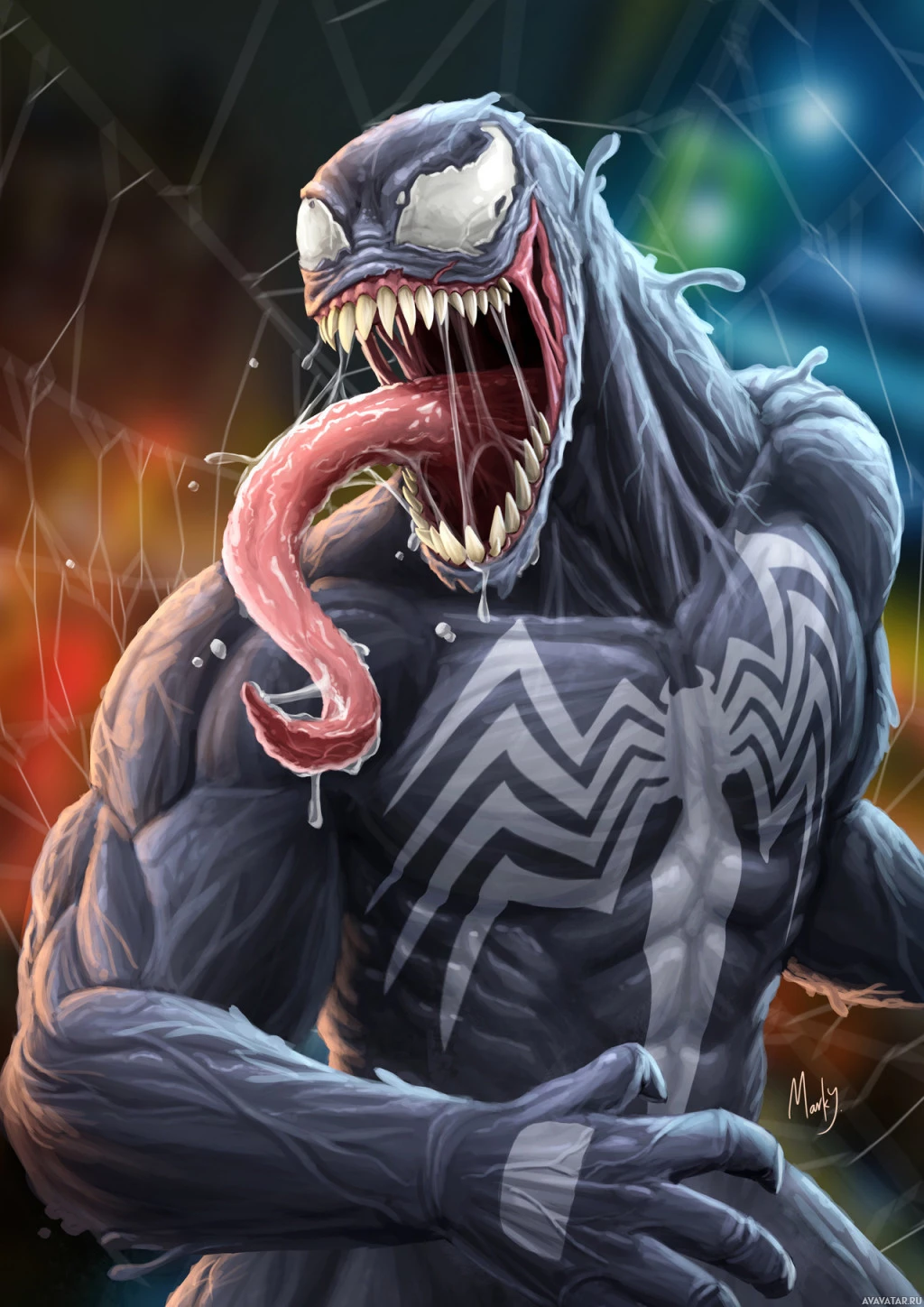 symbiote suit worn by the character, with white spider-like patterns and its characteristic red tongue sticking out of its mouth. It's an illustration rather than a photograph of