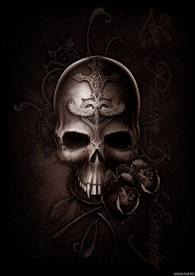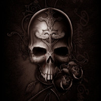 intricate designs around it, including a cross at the forehead. There are also floral elements and possibly some sort of script or text surrounding the skull, which might suggest a symbolic or mystical context to the design. The style appears to be heavily influenced by gothic or dark art themes, with a focus on symmetry and detail in the patterns.
