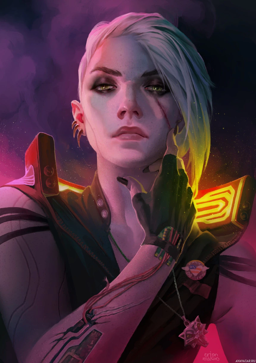 the video game Cyberpunk 2077. This character is styled in a futuristic and edgy way, featuring cybernetic enhancements,