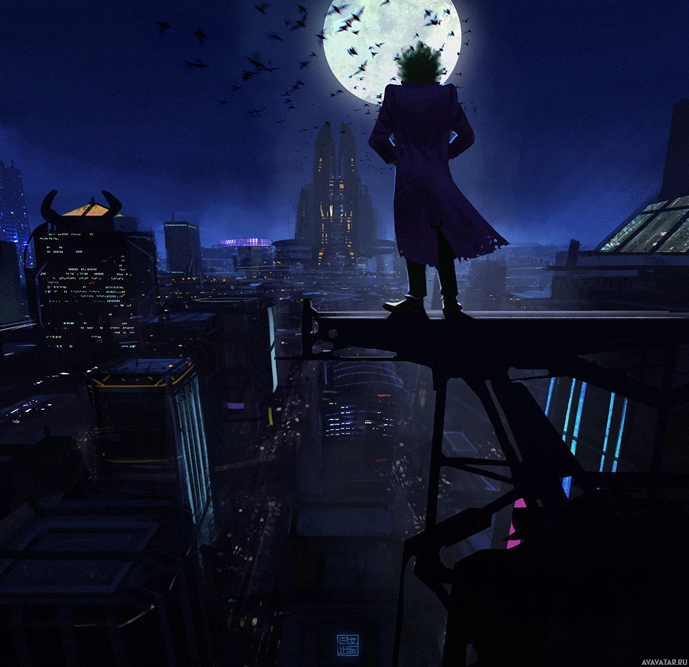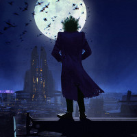 a video game or a comic book, given the presence of characters like the Joker in this type of setting. The Moon is visible in the sky, and there are bats flying around, contributing to a nocturnal,