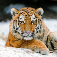 The picture features a tiger sitting on a rocky surface with snow around. The tiger appears to be young and has distinctive brown fur with darker markings typical of the Bengal tiger species. Its eyes are open, and it looks directly at the camera, giving a sense of engagement with the viewer.