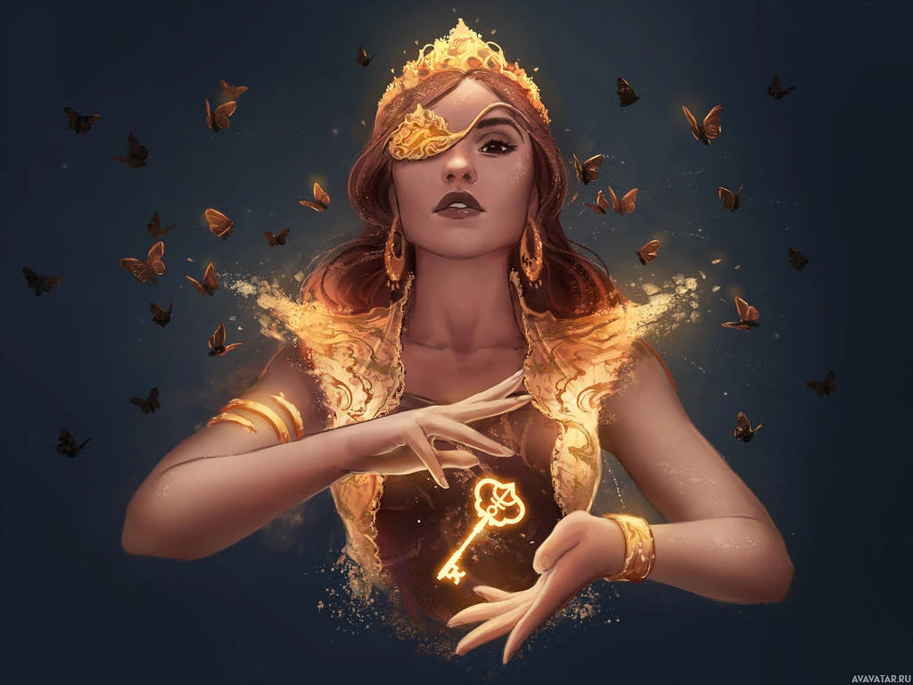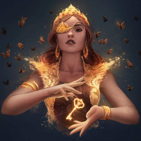 night sky, which complements the mystical atmosphere of the scene. There is also a key depicted in her hand or floating near her fingers, which might symbolize unlocking secrets, powers, or doors within a story or mythology.