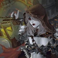 the dark attire and a hood that gives them a mysterious appearance. The background features what seems to be a chaotic battle scene, with fire and destruction around, adding to the dramatic and intense atmosphere of the image. The character's expression is serious, and their pose indicates readiness for combat or some form of confrontation. The overall style of the illustration suggests it could be from a fantasy art piece or an official piece of concept art for a game or story set in a darker fantasy universe.