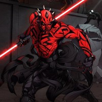 The image depicts a character dressed in red, resembling the appearance of Darth Maul from