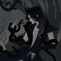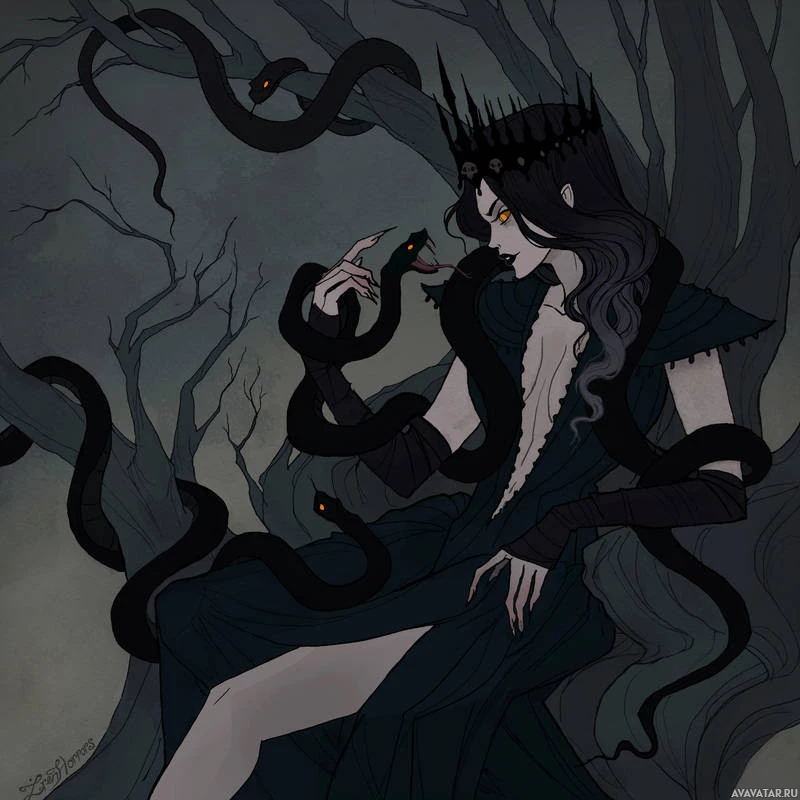 royal figure with a crown, sitting on a branch. She is surrounded by snakes and wearing