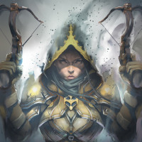 a Demon Hunter, wearing armor with a hood up and wielding a bow in both hands. They are set against