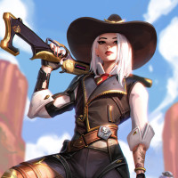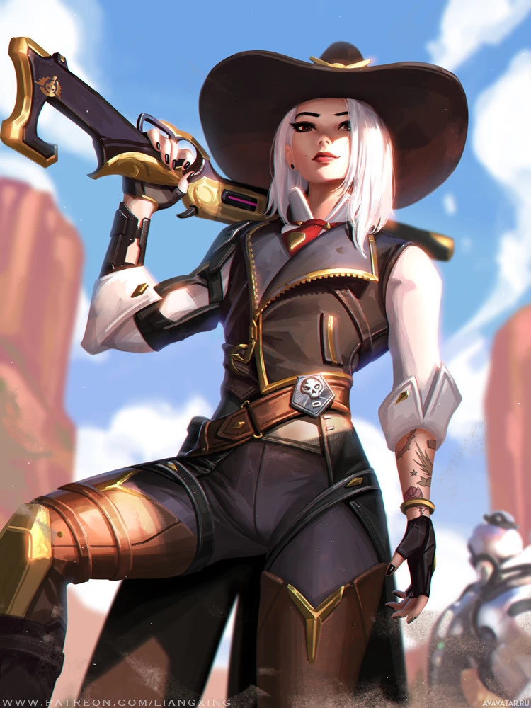 the video game Overwatch. She is known as Ashe and is a hero with an old-western style theme. Ashe is holding a gun in her right hand, which she typically uses for combat within the game. She's wearing a cowboy hat,