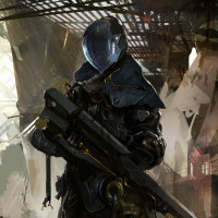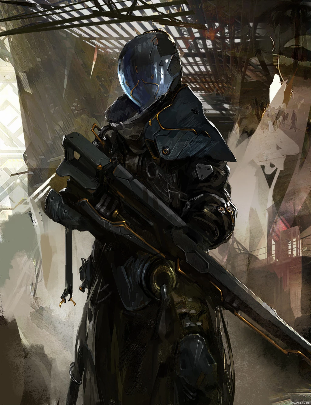 the science fiction genre. This character is wearing a helmet and has a weapon, which appears to be a rifle or shotgun. The setting seems to be a dystopian or post-apocalyptic environment with ruins in the background, suggesting
