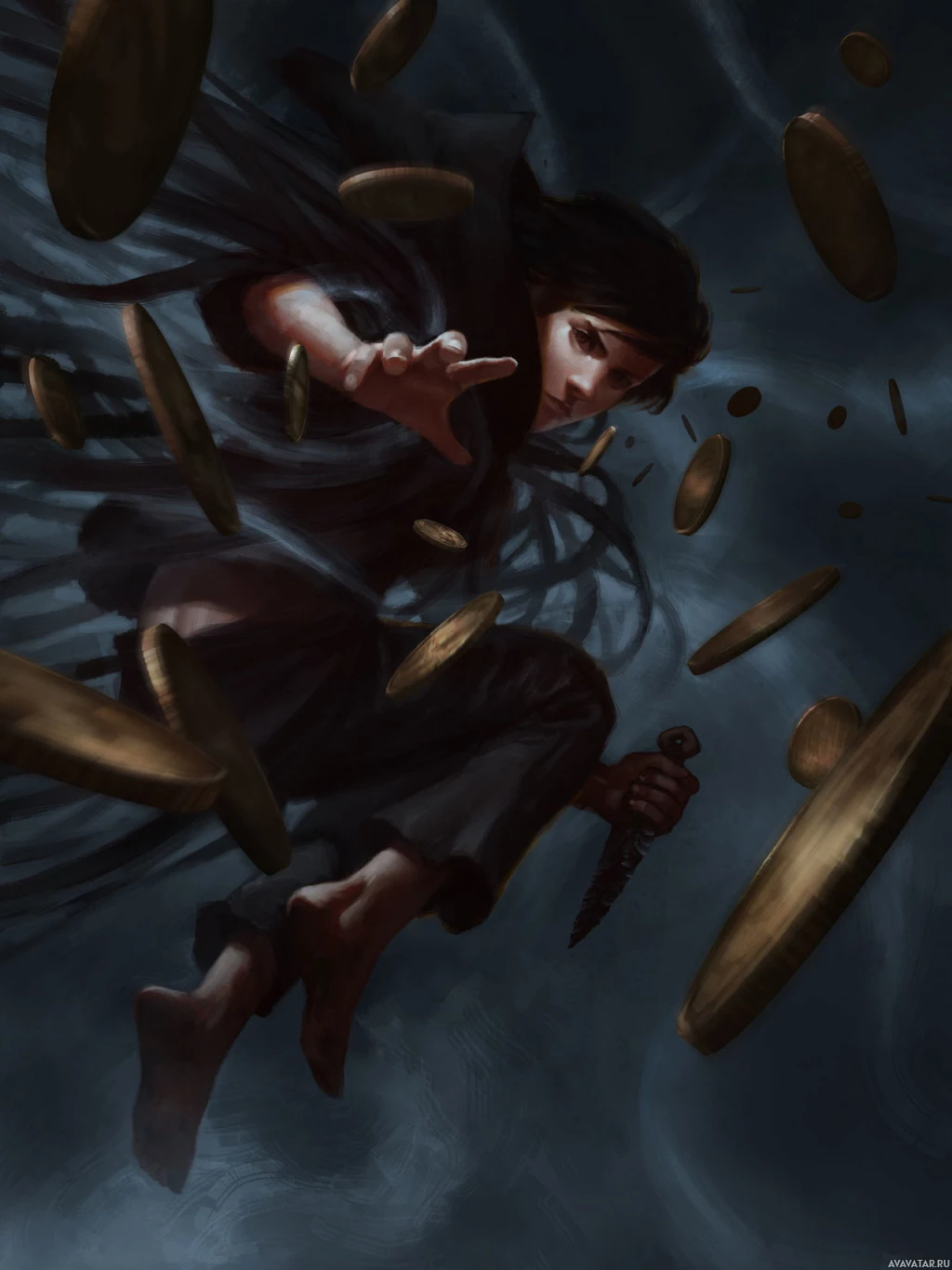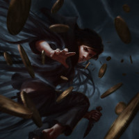 an animated character who appears to be a girl with dark hair. She is in mid-air, surrounded by what looks like coins that are floating around her. She has a sword in one hand and a staff or rod in the other. The background is a dark, ominous sky, suggesting a dramatic or adventurous scene. The character's expression conveys
