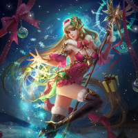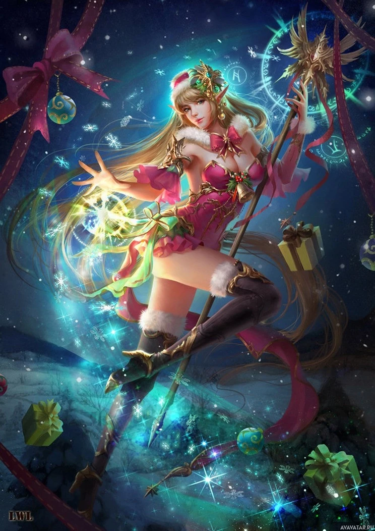 blonde hair and is wearing festive clothing that includes a Santa hat, suggesting she may be related to the Christmas season or simply celebrating the holiday. The character is holding a staff and seems to be floating above a landscape that could be interpreted as