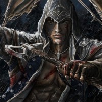 The image depicts a stylized, dynamic illustration of a character who appears to be from the "Assassin's Creed"